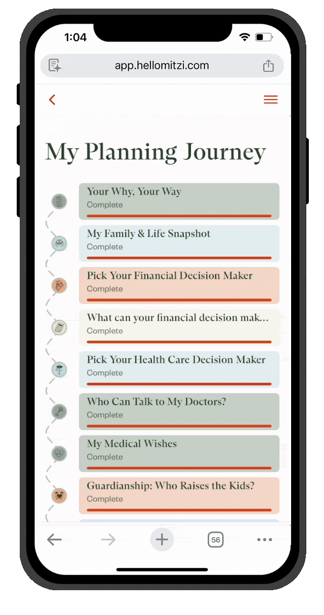 Your Durable Power of Attorney for Finances, Patient Advocate Designation, Advance Directive, and Guardianship Designation – all drafted and ready to review. Most people are done in under an hour. Some finish faster.